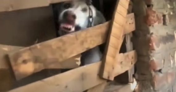 Dog rescuers were called upon regarding a cruelty case in which a dog was locked away in a room for a year and a half. He was left to fend for himself and forgotten about, so of course he became aggressive toward humans. The dog snarled and showed his teeth to rescuers through wooden planks covering a window.