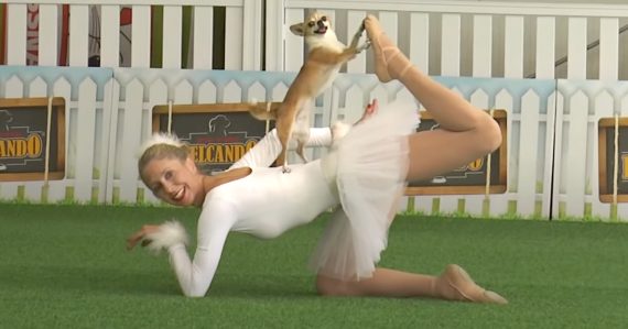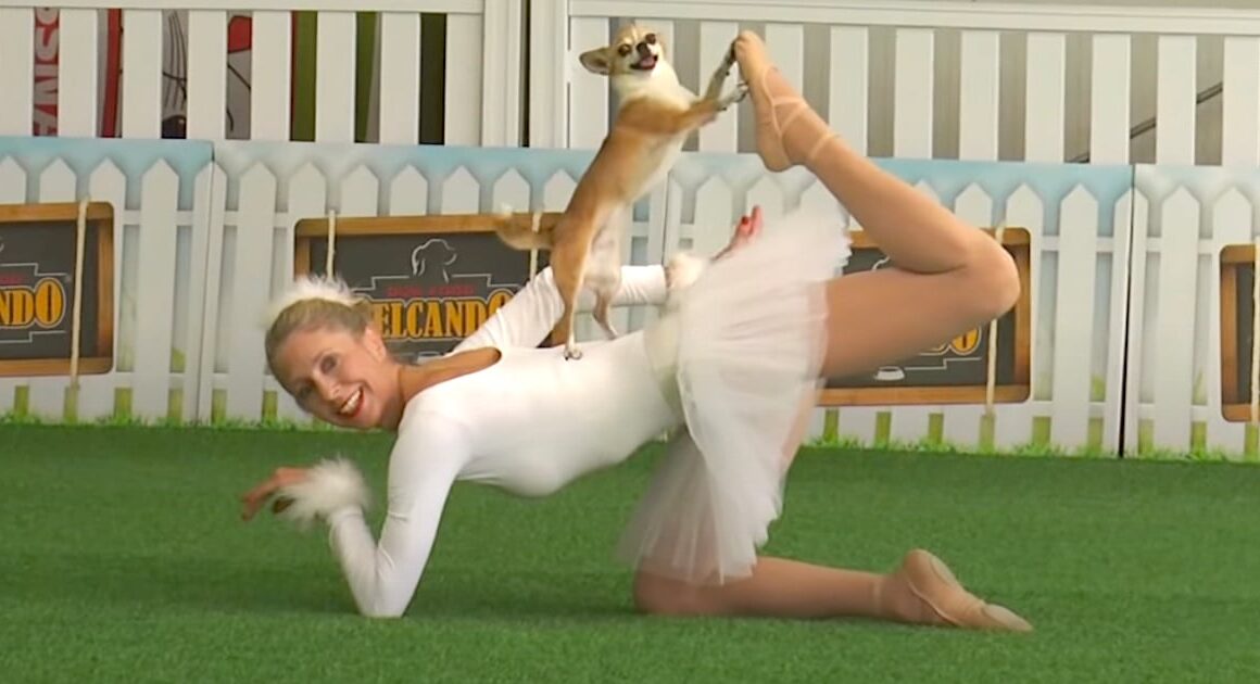 Watch as Mom and her Chihuahua take their positions to perform “Swan Lake.” The music starts, and away they go! They pull off so many amazing maneuvers it’s hard to pick a favorite, but I’ll go with the stance at 50 seconds into the video. The crowd’s reaction says it all–Incredible! π