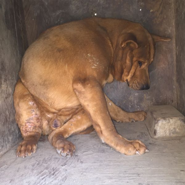 The dog was very scared after everything he had gone through. They had to use force to remove the dog from the box.