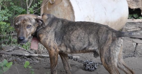 The dogs on this property were found covered in fleas and had visible scarring, consistent with injuries typically seen in dogfighting cases. They were found living outside on heavy, weighted chains and did not have access to adequate shelter β€” only blue barrels and dilapidated wooden shacks. Despite the poor conditions the dogs were found suffering in, the Animal Rescue team noted that they wagged their tails and were eager for attention.