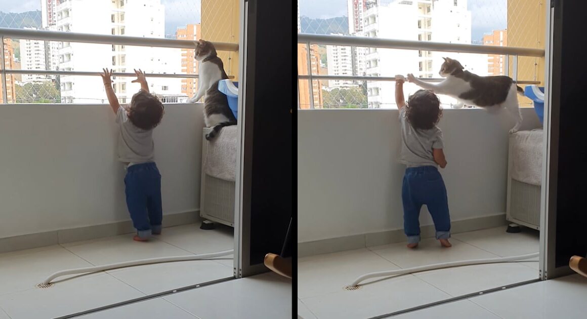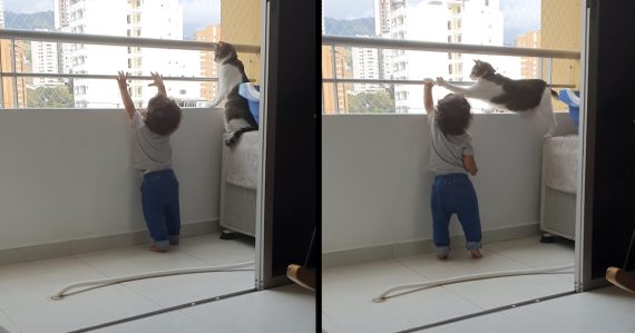 When the little boy decides he wants a better view while out on the balcony, the cat prevents him from getting too close to the ledge. There is a security mesh net in place there keeping the child from any real danger, but the kitty doesn’t know that! πŸ˜‰ What a special little helper to have in his life…