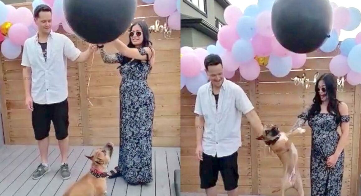 Marie del Rosario and Jasa Grant readied the balloon at their gender reveal party with the plan to have their Bull Terrier/French Bulldog mix, Doobie, pop it to show the blue or pink confetti inside. But when the dog jumped up to hit the balloon, it flew up into the sky and away! The moment was ruined, but only temporarily; The balloon happened to land in a nearby park, and it was retrieved slightly deflated. But that meant a second try for Doobie! π