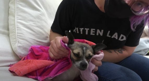 With a cheeseburger in hand, JoAnn was able to lure the dog over. She would then use a gentle snare to secure the Chihuahua for good. Rescuers spoke to a neighbor who’d been feeding the dog for a week, and he’d named her Frijoles.