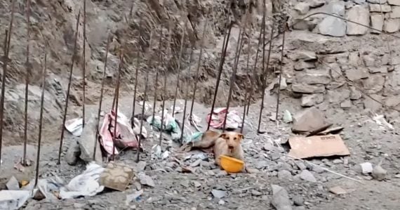 Neighbors spotted a dog lying by a rod at a construction site. When they got closer, they saw that the rod had pierced through her thigh and impaled her. She couldn’t get free no matter how much she tried. So they called Animal Aid Unlimited to the rescue, and they quickly arranged for workers to show up with an electric metal saw.
