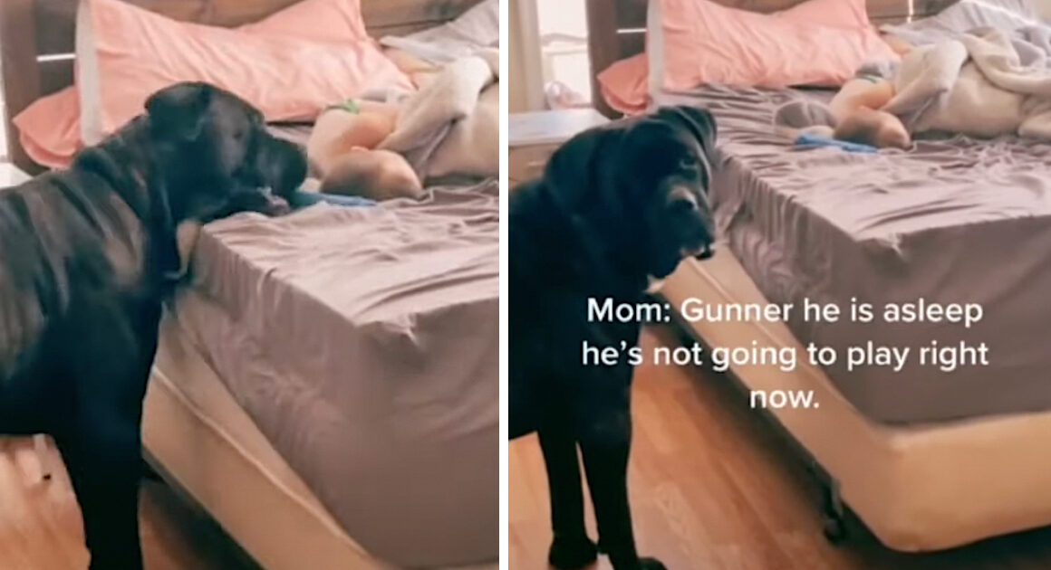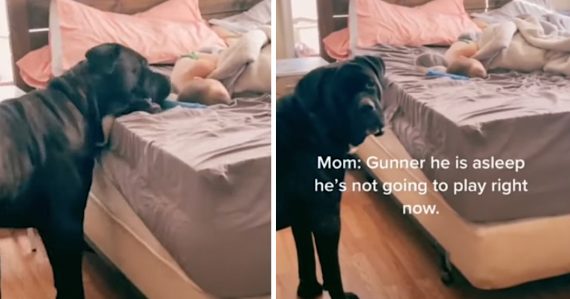 Gunner wants nothing more than to play, but his human brother is currently down for a nap. This is unacceptable, so the dog does everything possible in order to try and wake him… But the kid must be one heck of a deep sleeper!