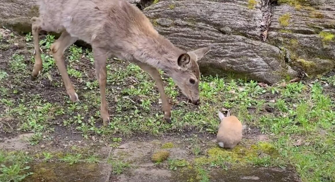 Out near the woods, a woman comes across a wild fawn who just noticed a little bunny rabbit and didn’t know what to think of the strange creature. It approaches to do some investigating and actually listens to the human’s advice to be gentle and not hurt it. Is this a real life Bambi and Thumper?