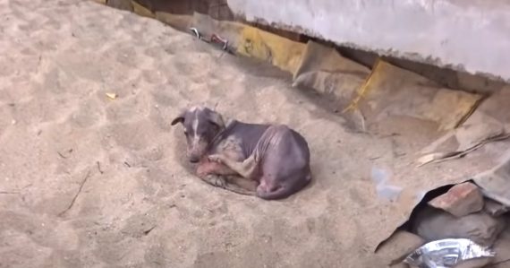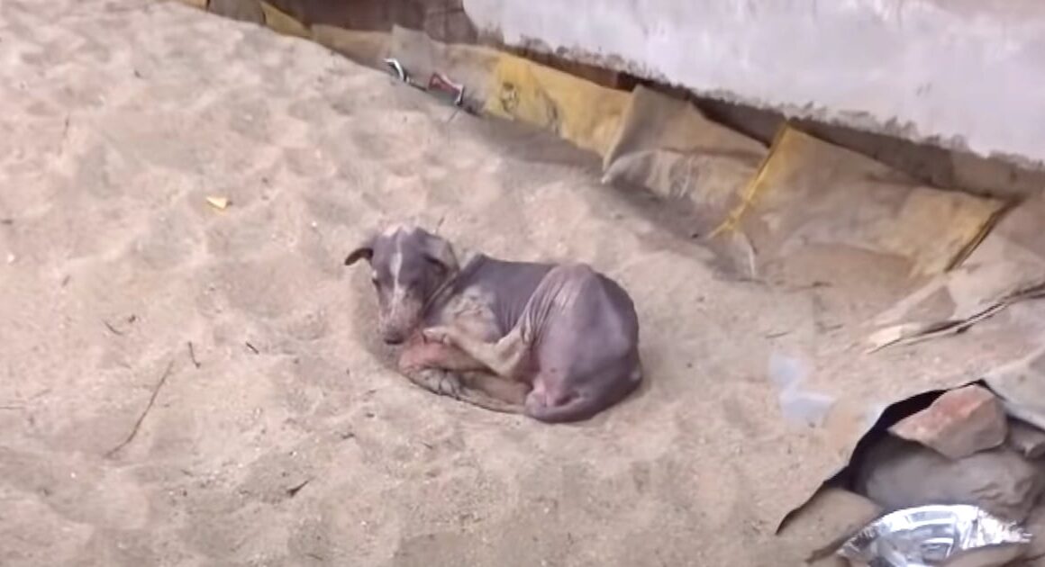 A street dog was found curled up in pain without any fur. His body burned because of his severe mange, and it rendered him motionless. Animal Aid Unlimited arrived on scene to capture him, and he seemed OK with human touch. But when the rescuer tried lifting him, he got scared. So they would have to use the net.