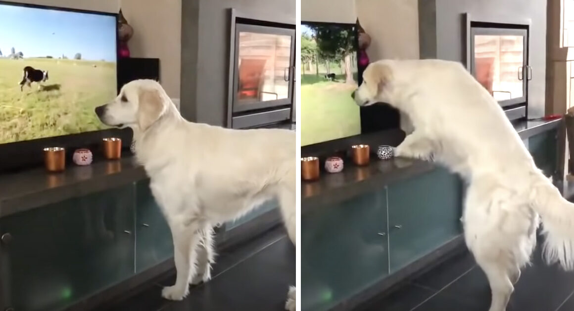 When the Golden Retriever sees another dog on TV, she goes wild! She’s so close to having playtime, she just has to get that dog’s attention. Watch as Maya jumps up on the TV stand and tries to get even closer to her new friend!