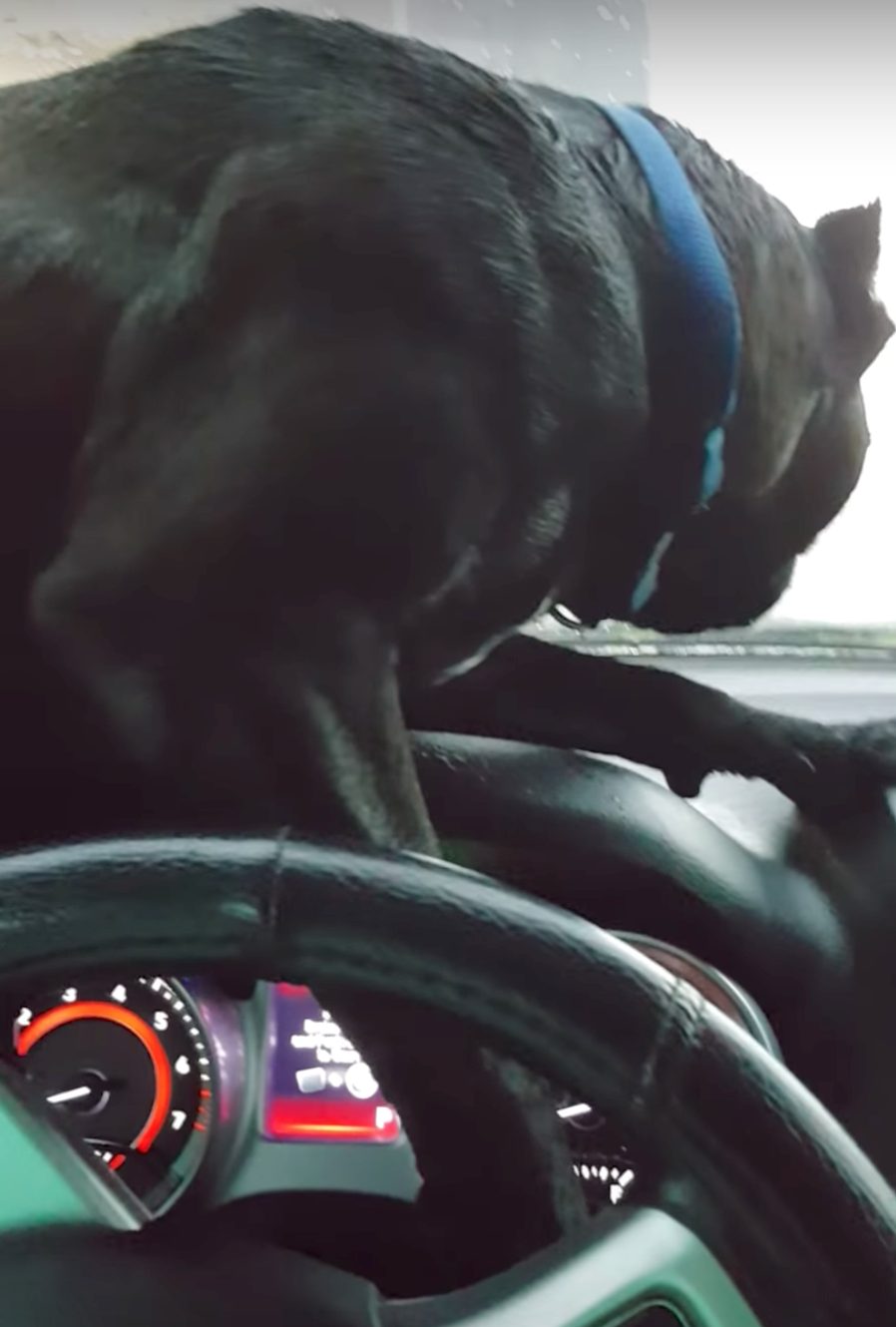 The camera shakes violently as the dog perches himself on top of the steering wheel, and they can’t help but laugh at what’s going on! It’s not long before the pit makes his way to the passenger seat where he looks back as if to say, “Where’s that food you promised?” π