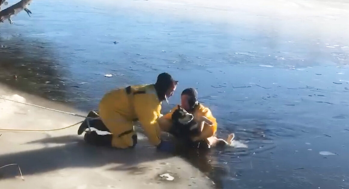 After falling through the ice on a river in Michigan, a Husky found himself trapped, freezing, and on the brink of certain death. But these heroic firefighters showed up, and the whole rescue was captured on a cell phone.