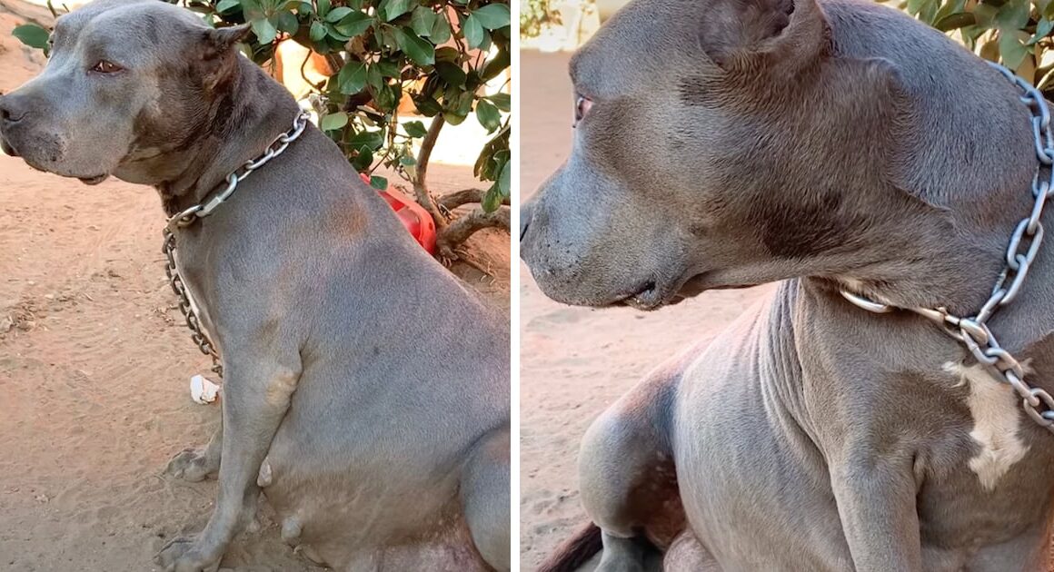 Blue the pittie sat on the end of her short chain as pregnant as can be. She was ready to burst at any moment. Thankfully, someone showed up just in time to talk her owners into handing her over. As soon as they got home, the dog went into labor…