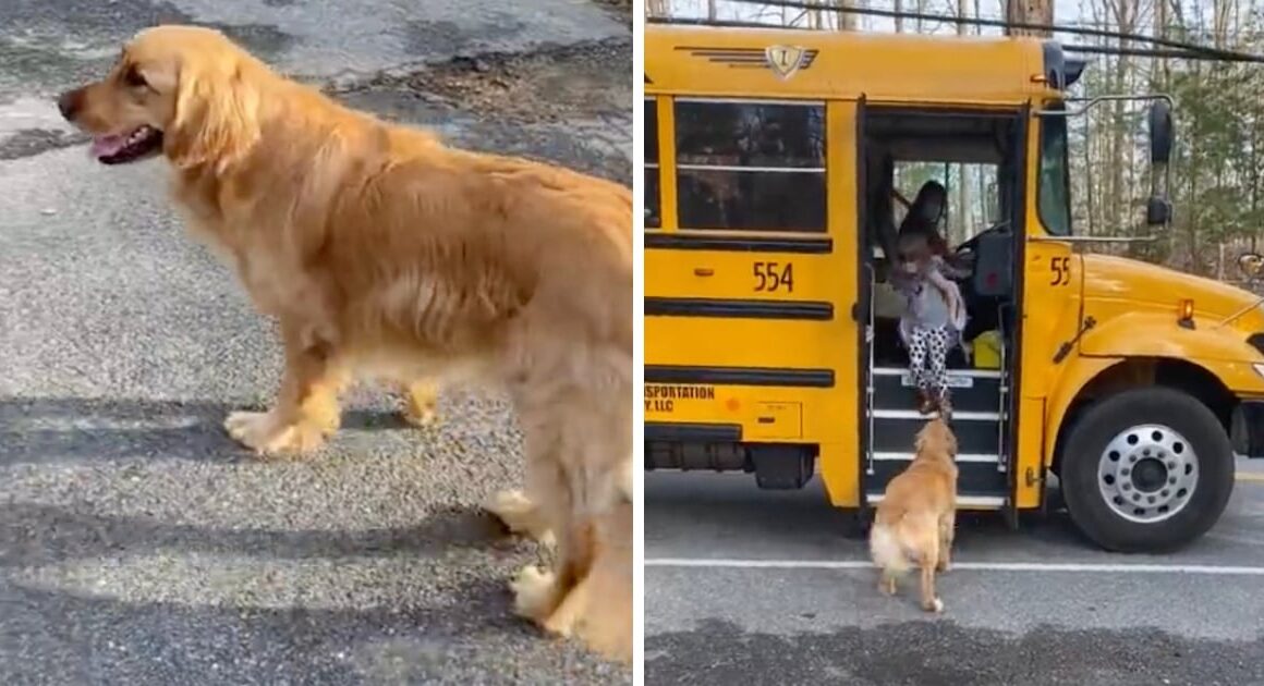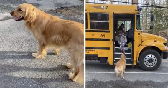 Kody the Golden Retriever is quite the helper! Every day, he waits for the school bus to bring home his human sister, Autumn, and she removes her backpack to hand to him. The dog proceeds to take it and walk it all the way back to the house for her!