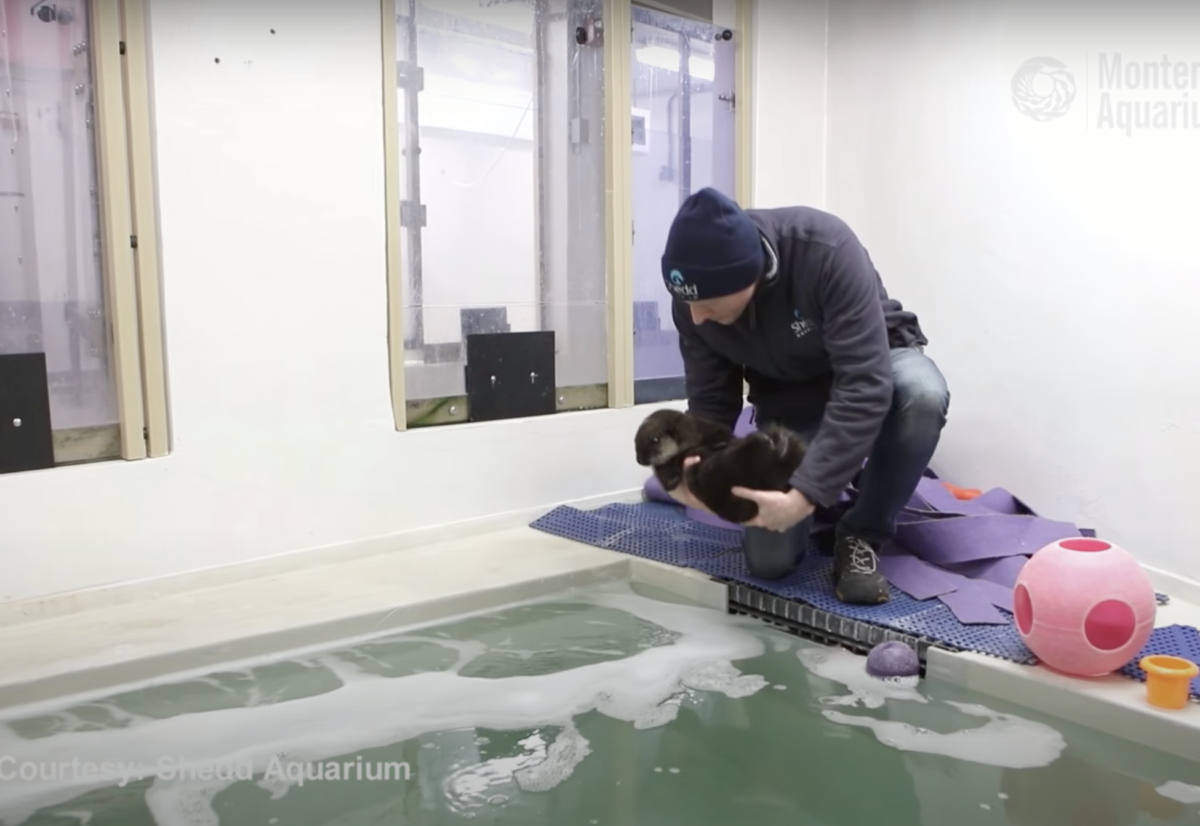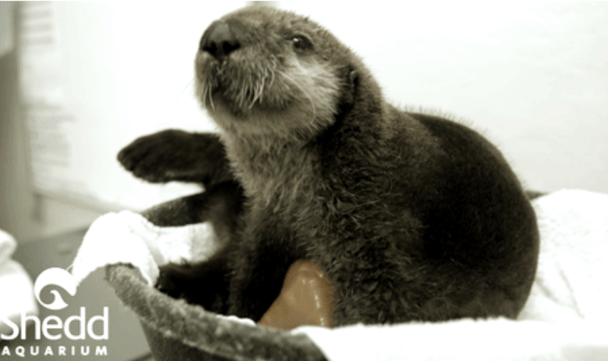 The day before this baby otter was transferred to Shedd Aquarium, she had the pleasure of being in care at Monterey Bay. The humans there knew it would be important for her to adapt to various otter activities, so the pup learned about solid foods and swimming in water below your belly.