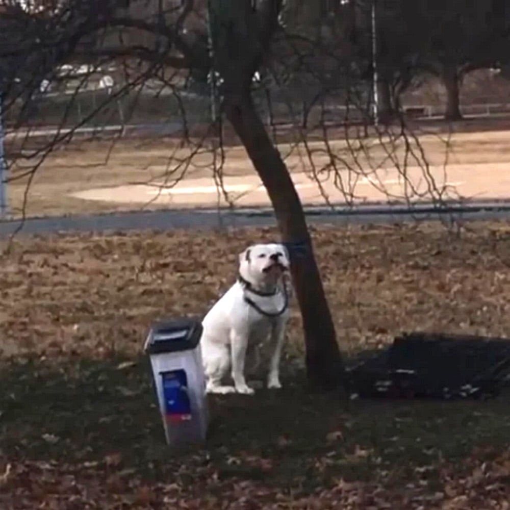 When Leslie Gray’s husband was walking his dog in the park, the last thing he expected to see was a dog tied to a tree and abandoned in the freezing cold. He was shocked to find a 2-year-old American Bulldog tied to a tree and left there with a note attached to him. The note said “My name is Duke. Hereโs my favorite toy and my food. I am looking for a new home.”