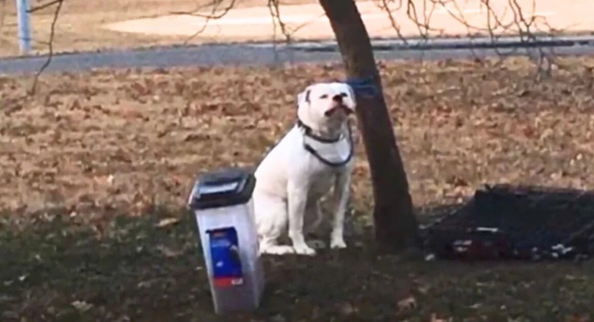 When Leslie Gray’s husband was walking his dog in the park, the last thing he expected to see was a dog tied to a tree and abandoned in the freezing cold. He was shocked to find a 2-year-old American Bulldog tied to a tree and left there with a note attached to him. The note said “My name is Duke. Hereโs my favorite toy and my food. I am looking for a new home.”