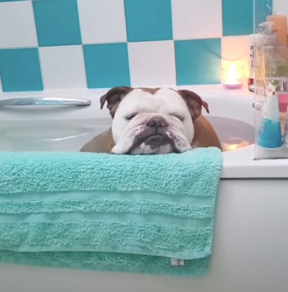 That face says it all, doesn’t it? The dog chills with her head slumped over the side of the candle lit bath as she enjoys the soak. Have you ever seen anything like it? π