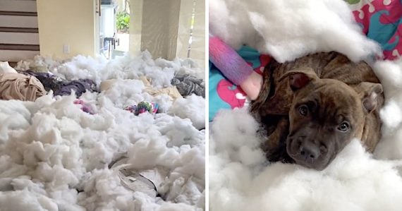 Mom walked in on the mess and couldn’t believe what she was seeing. There was stuffing everywhere, and that’s where Jazmine took up a hiding spot! Mom was so impressed, she couldn’t even be mad! The dog looked up at her with those big eyes and that was that. Oh my!
