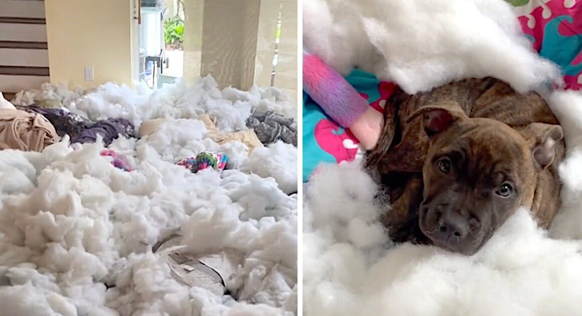 Mom walked in on the mess and couldn’t believe what she was seeing. There was stuffing everywhere, and that’s where Jazmine took up a hiding spot! Mom was so impressed, she couldn’t even be mad! The dog looked up at her with those big eyes and that was that. Oh my!