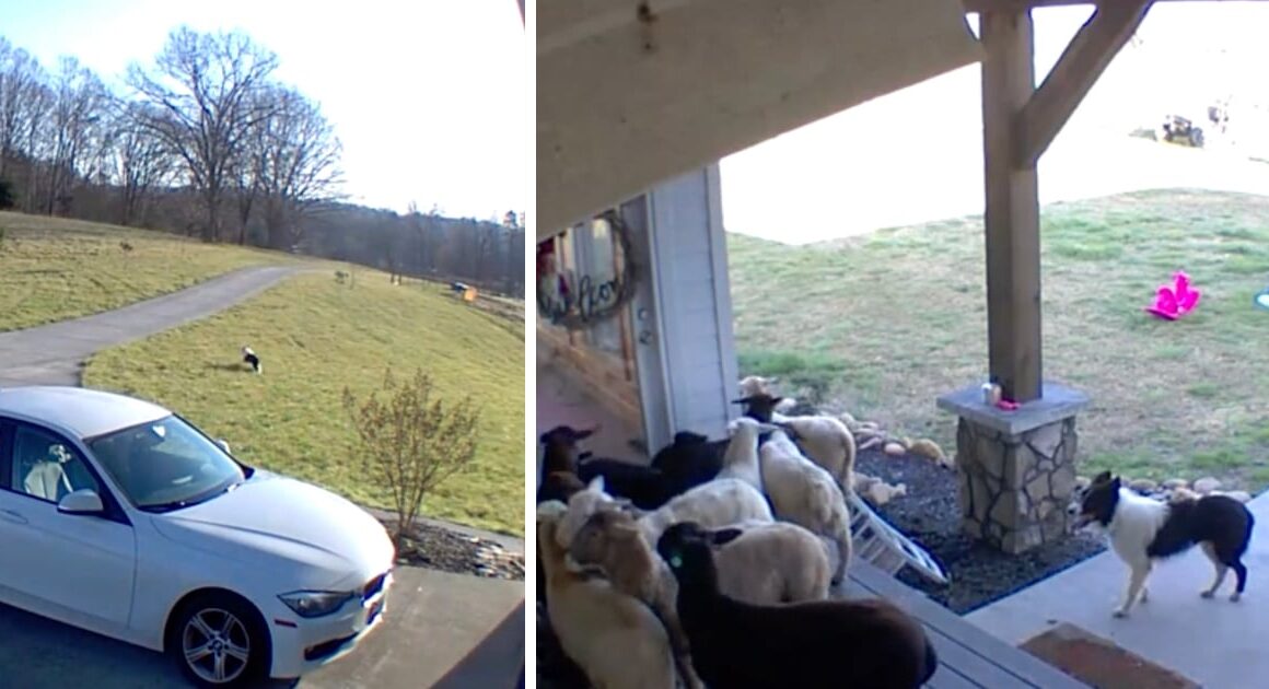 “Doc is a 14-month-old Border Collie who lives and works on a cattle and sheep farm in Dandridge, TN. He got loose one morning and went straight to work. He went down to the sheep pasture and herded the sheep out of their field, around the house, and up onto the porch. He was simply doing his job even though nobody was home. He was only loose for a few minutes before someone came home and put him back up. There was some minor destruction of a candle and a wooden chair on the porch otherwise everyone is doing just fine.”