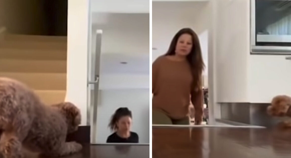 The sneaky pup always hides around the corner to pop out and scare his owner as she comes up the steps. But once Mom catches on, the clever dog switches sides to get her again. So smart!