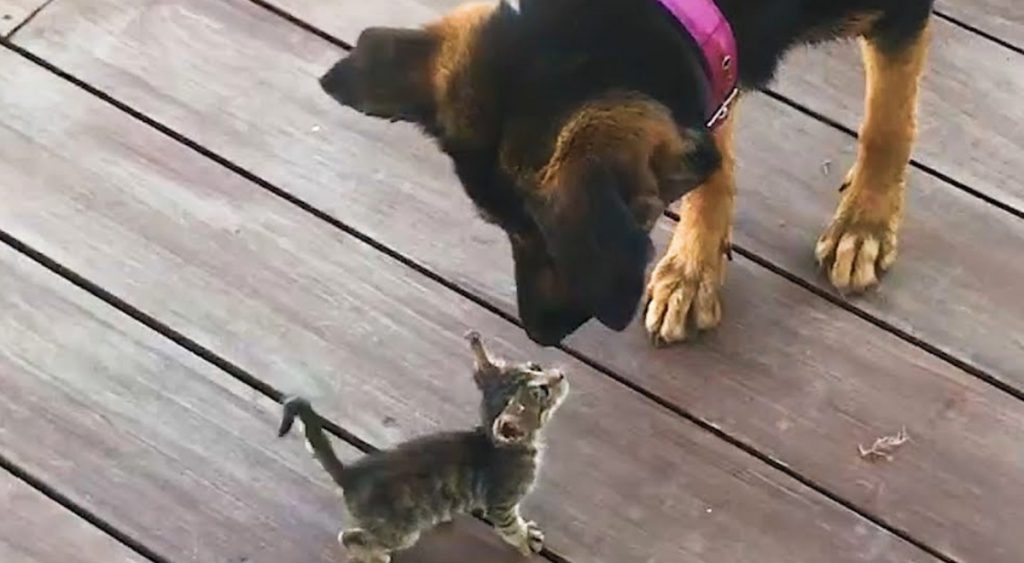 One day, a tiny kitten was spotted outside of Toast’s house. Mom told the dog to be gentle, and Toast was as sweet as could be. There was no mother cat around, and the little one proceeded to follow them into the house!