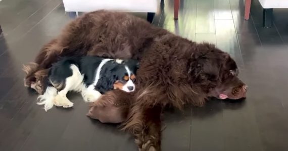“Rambo the Cavalier King Charles and Samson the Newfoundland are living the good life. They even have their best friend Sierra serenading them to sleep today. Watch how peaceful and content these two are as Sierra practices her music for the day. What a sweet moment!”