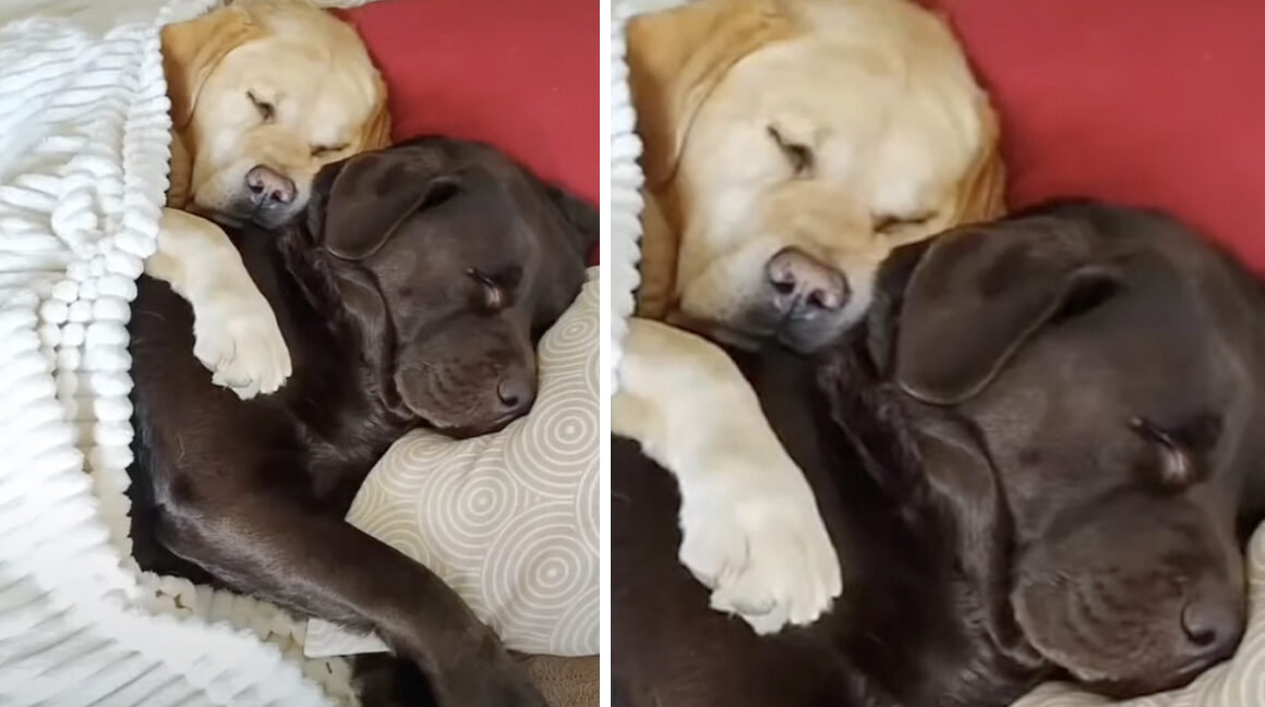 “Scott and Tex are two drowsy Labradors who love to sleep snuggled in a cozy bed. Can you guess which one of them is snoring?” πŸ˜€
