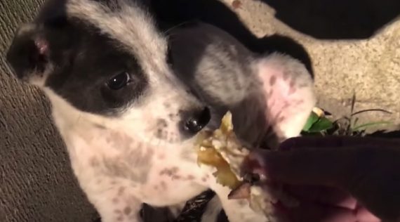 But help was on the way! Prue from Mission Paws’ible made it through the busy traffic to get to the dog, but the pup barked out of fear. It wasn’t until the rescuer went back to her car and grabbed some lasagna that the puppy started to trust her. And that was the turning point! π