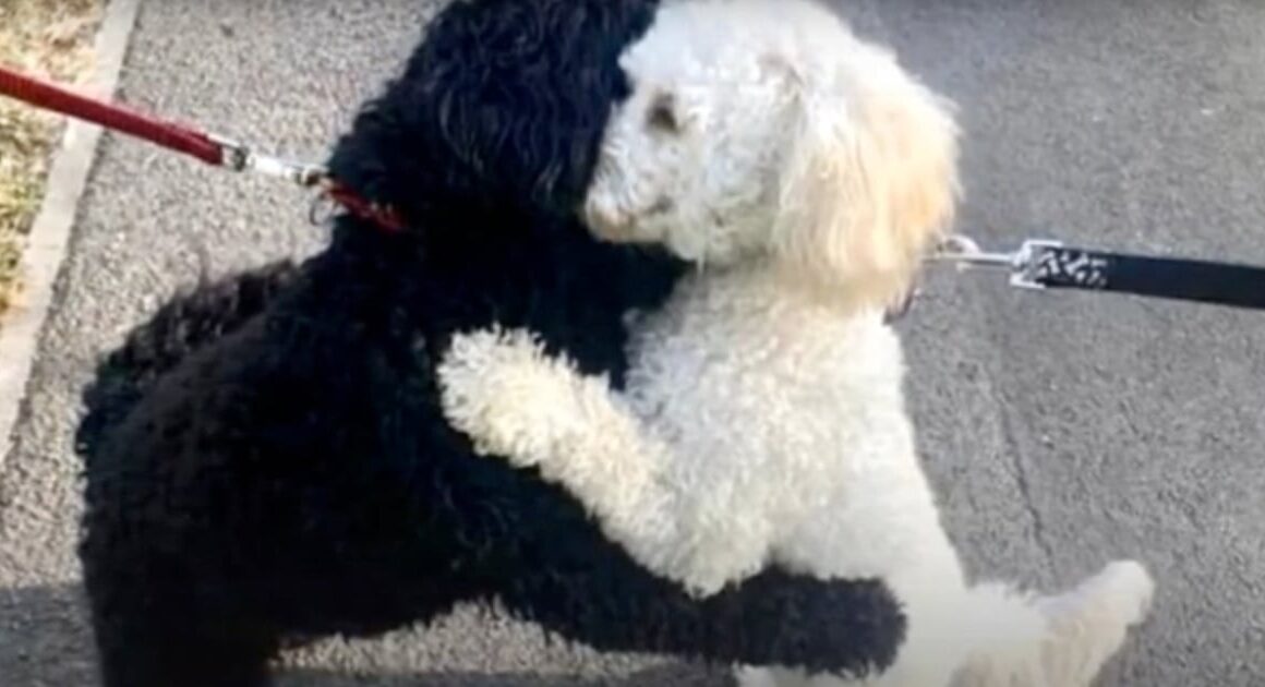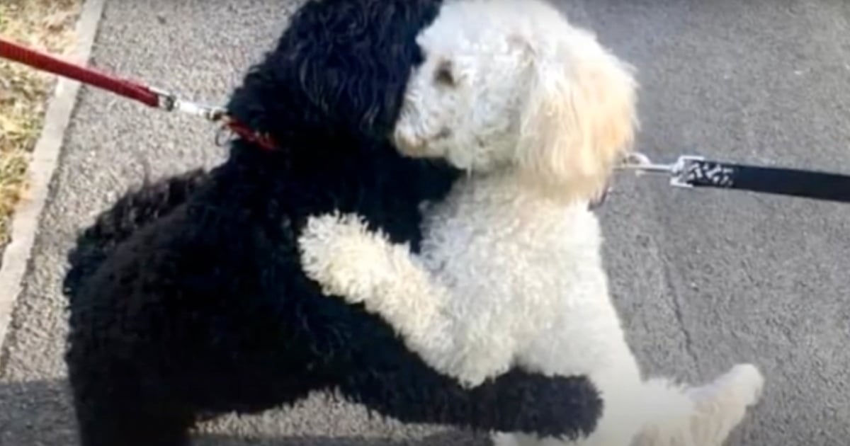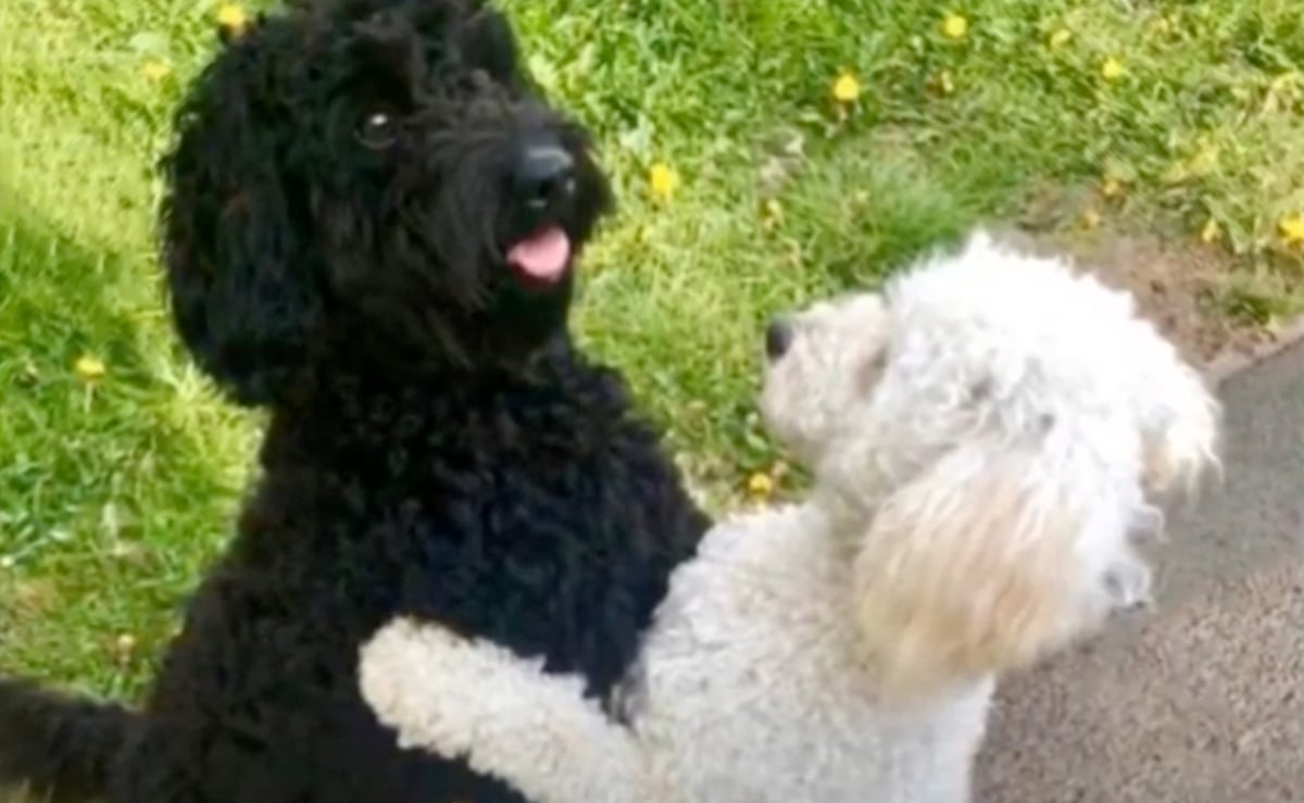 A man named Dave was out walking his one-year-old Cockapoo, Monty, when he came across another person walking their very similar-looking dog. Without so much of a hesitation, the two dogs locked paws around each other for a hug!
