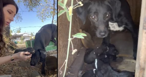 A woman heard whining coming from an underground pipe and looked inside to investigate. That’s when she saw two big eyes staring back at her! It was a mama dog and her newborn pups all cuddled up together.