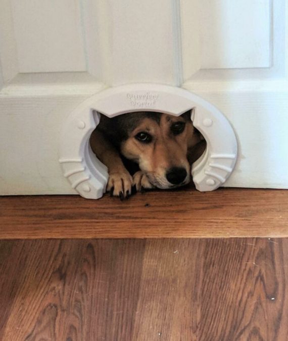 #10 – “My husband leaves for work earlier than I do. He keeps the dog out so she won’t wake me up. However, we have a cat door to our bedroom. This is how I’m greeted most mornings.”