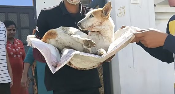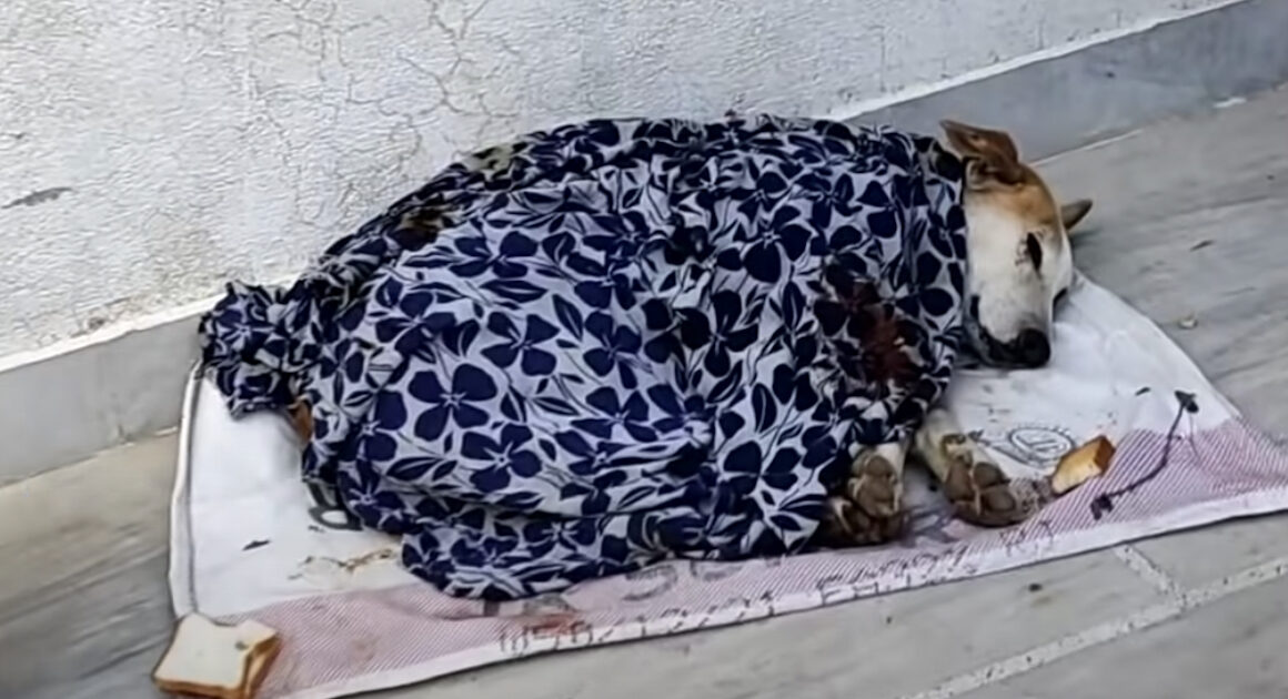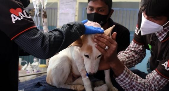 Animal Aid Unlimited rescuers were called upon after a village found their street dog lying in grave danger. She had a huge wound around her neck and needed help immediately, and they wrapped her in a blanket to try to keep her as calm and comfortable as possible…