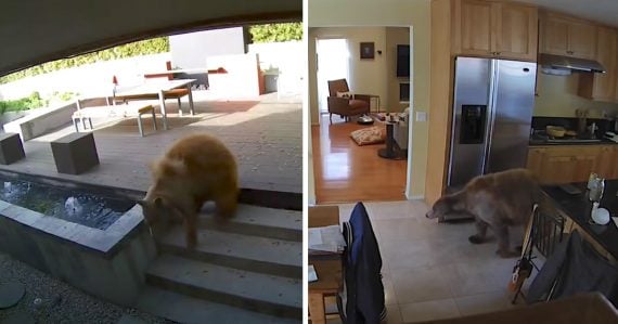 “Young bear visited our Pasadena hillside home and ventured into the house through open kitchen door. Our two small terriers Squirt and Mei Mei said NO.”