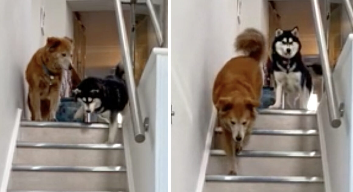 The older dog takes the lead to teach her how it’s done, and the sound of the jingling collar with each step taken really paints a picture. That’s when the brave Husky musters up the courage to give it a try of her own. Mom cheers her on, and you don’t want to miss the result…