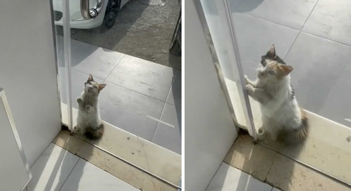 Rayan Algamadi owns an electronics shop in Saudi Arabia, and one day he saw a different kind of customer at the door; As the region was being blasted by a heatwave, a cat was looking for some refuge and escape from the high temperatures. The feline scratched at the door just pleading with the man to let her inside…