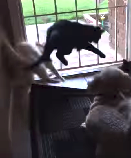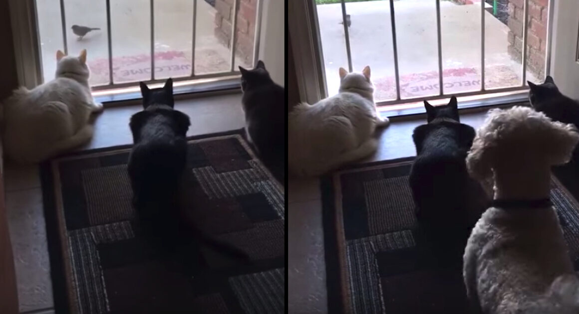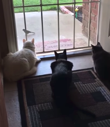 The cats are calmly bird-watching through the door and enjoying the view. But then the dog decides to show up and ruin the entire experience! To say the cats are startled is a huge understatement.