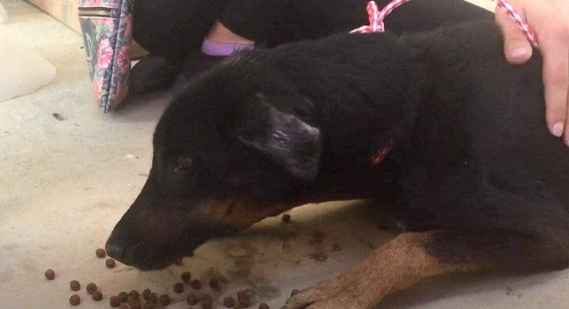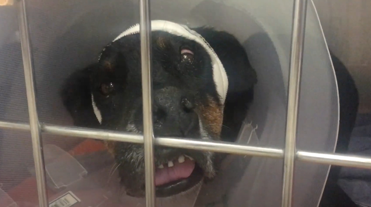 Odie was confiscated from an uncooperative owner by Sidewalk Specials. The poor dog had been chained up and starved for 7 years, and his bony body showed it. He scarfed down some kibble as it was his first real meal in probably forever, and rescuers got him back to Cape Town and Vet Point for a checkup.