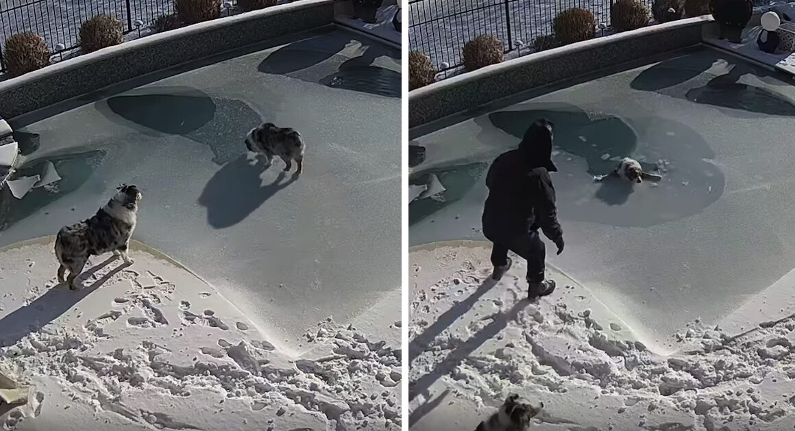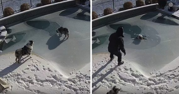 Dan Holmes was outside accessing the snowy scene and damage when one of his dogs, Christi, ventured out onto the icy surface of their pool. It couldn’t hold her weight, and she crashed through into the freezing cold water below. Dad came over in a panic willing to do whatever necessary to save his pet, even if it meant getting in there himself.