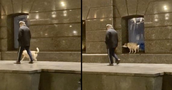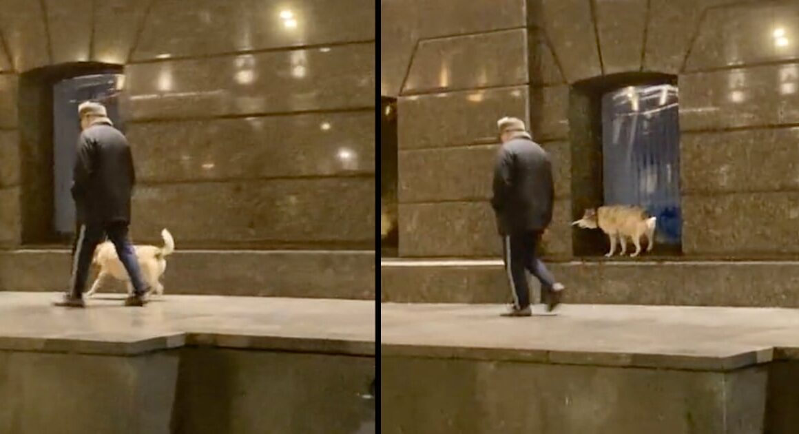 This silly pooch made up his very own game to play while out on his walk with his owner. The dog jumps up and into each archway along the side of the building, something you could imagine a child coming up with! This just proves dogs have imaginations too! π