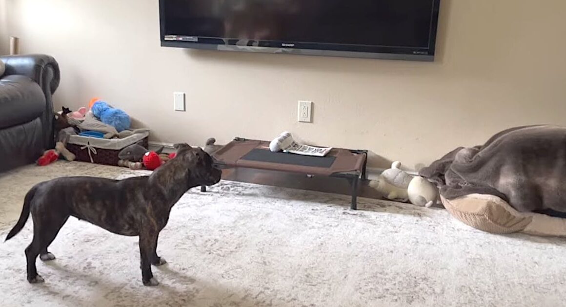 Puddy the dog walks into the room and immediately finds that her bed is occupied. This should not be a thing nor is it OK, so she goes over to investigate right away. Who or what could this be? π
