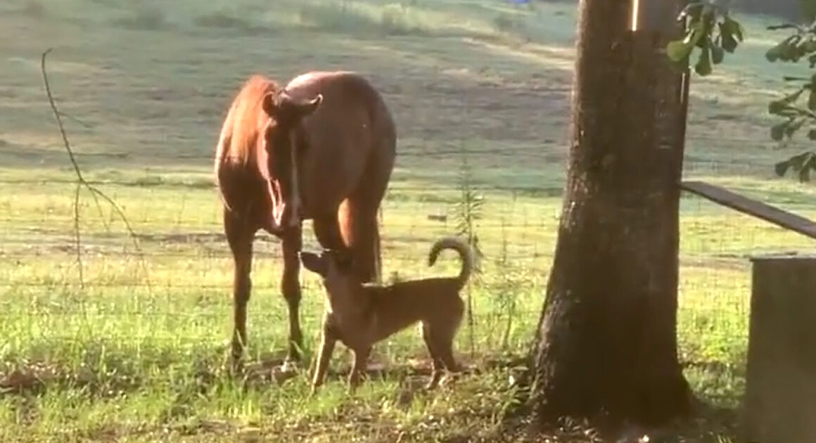 Just take a look at this dog and horse. Peaches the Malinois goes out to meet Gunner the horse for the very first time, and Mom makes sure to record the interaction. Time seems to stop as they come nose-to-nose, and then shenanigans are on the menu! πŸ˜€