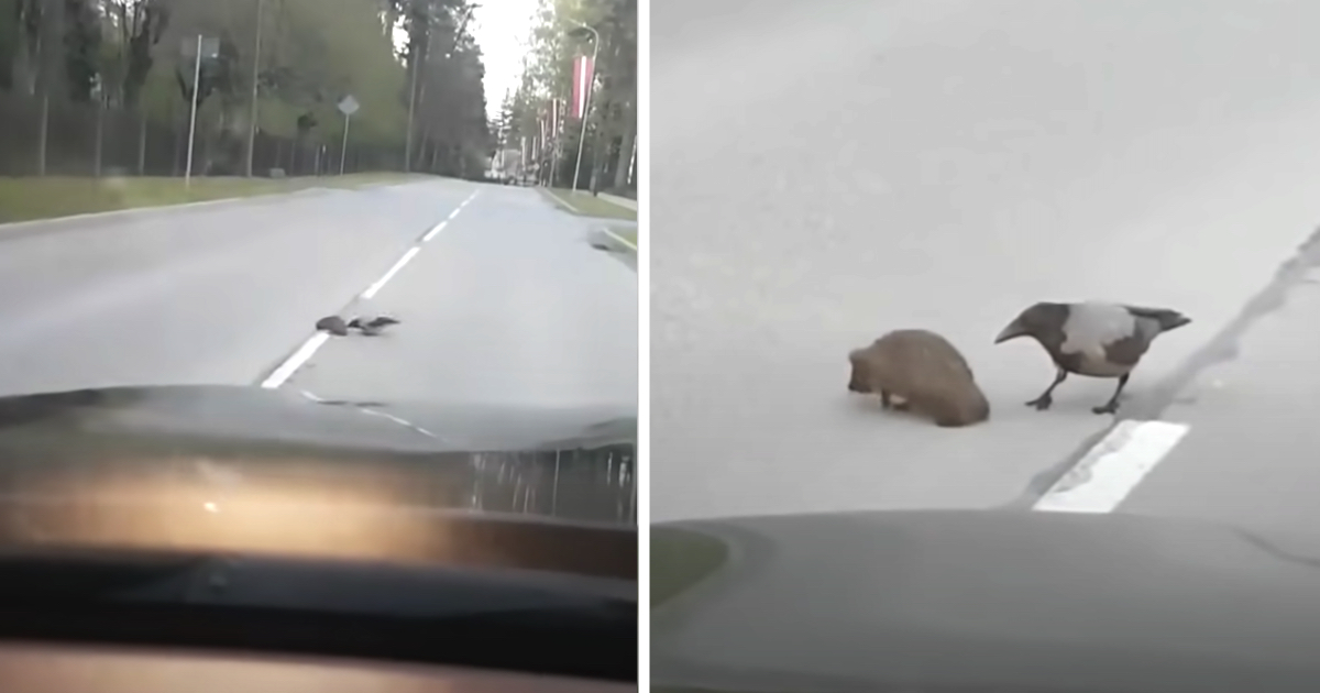 A driver slowed as they saw the two animals on the street, but it was the kind of interruption you’re happy to deal with! Right there was a seemingly lost and directionless hedgehog receiving some help from a kind crow. The crow kept assisting with its beak to point the hedgehog in the right direction to help him move out of harm’s way. It’s truly an amazing thing to see! π