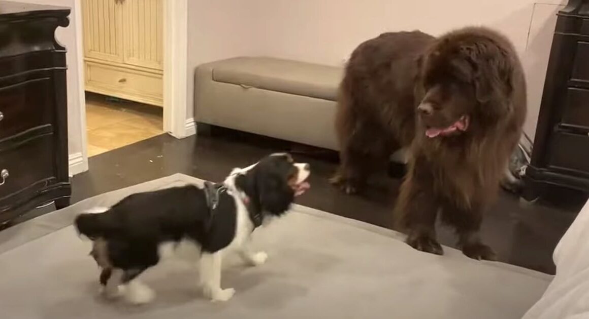 Samson the Newfoundland is playing with his doggy friend Rambo the Cavalier King Charles late at night. And he knows what that means, but he’s still learning! It’s time to lower the volume in the house, and Mom has to swoop in with the reminder. π