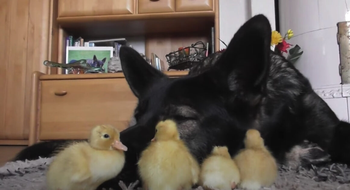 As the dog is just lying there and resting, they place the day-old ducklings beside him. You can tell the German Shepherd is a little curious, but he’s mostly so chill about it all. The little ducklings even seem to take a strong interest in the pooch as they waddle up closer and closer to his face. How cute!
