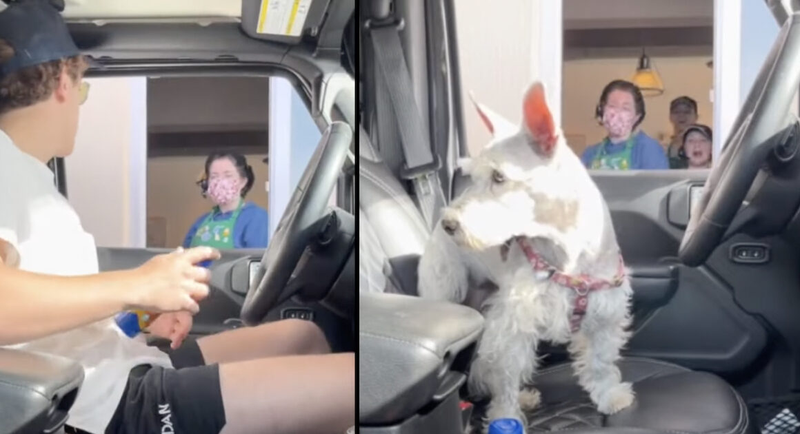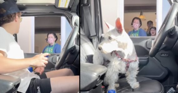 This guy pranks some workers when pulling up to the drive-thru window by waiting for the right moment and switching places with his dog. He moves to the backseat, and the pup to the front by his lonesome. And then the employees come back for a real surprise…