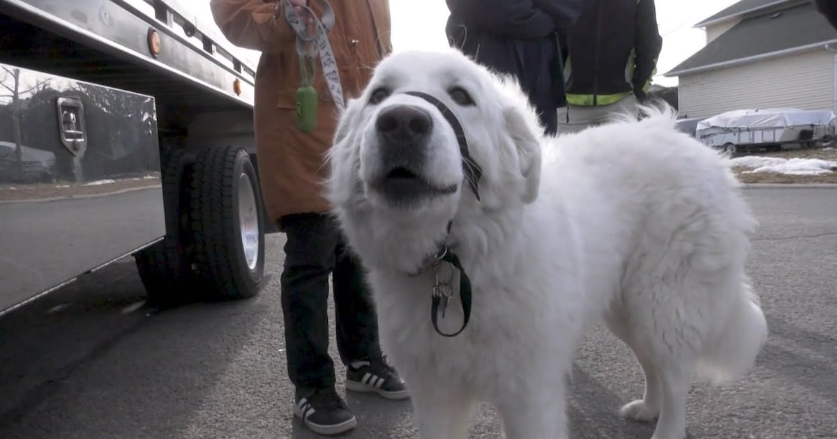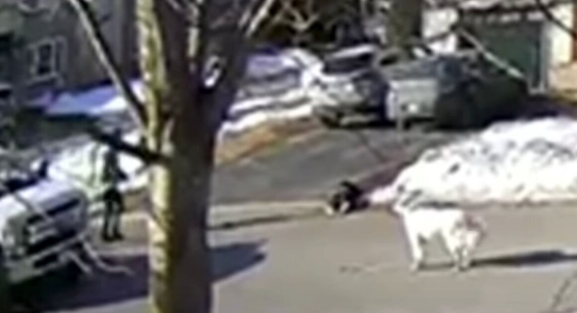 Security camera footage shows Clover, a Maremma mix dog, stopping traffic to help Haley during a sudden medical emergency while out on a walk. The video is pretty incredible to witness.