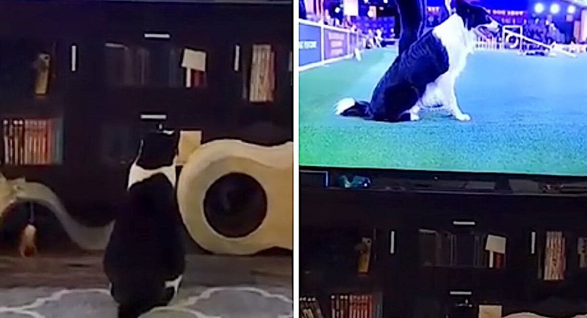 The cat takes interest in a dog agility course competition, and one Border Collie in particular. Not only is the course and all of its parts interesting to see play out, this dog is pretty good at it and even has a similar look to the cat! π
