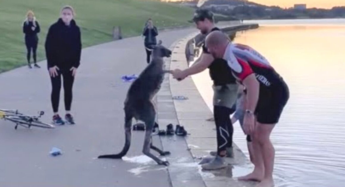 Kangaroos are very strong animals, so they had to be careful not to spook him. They ended up getting him to solid ground without much resistance, and that’s where it set in for the ‘roo; He realized these people just saved him and shook each of their hands! How sweet. π
