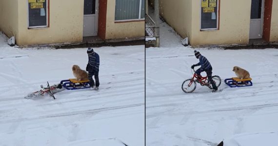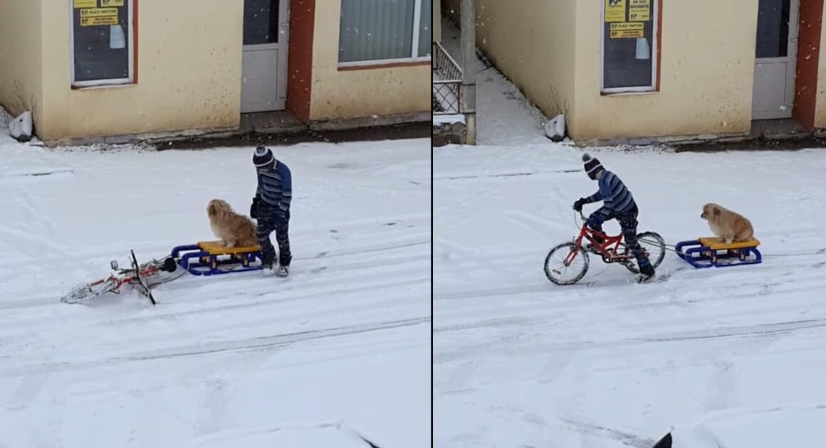 The streets of Romania were empty after a big snowstorm. But one little boy saw this as an opportunity to have some fun while everyone else stayed inside their warm homes. Instead of going on their typical walk, 12-year-old Andrei took his dog, Pufi, outside for a different reason!