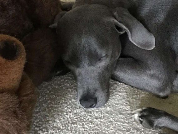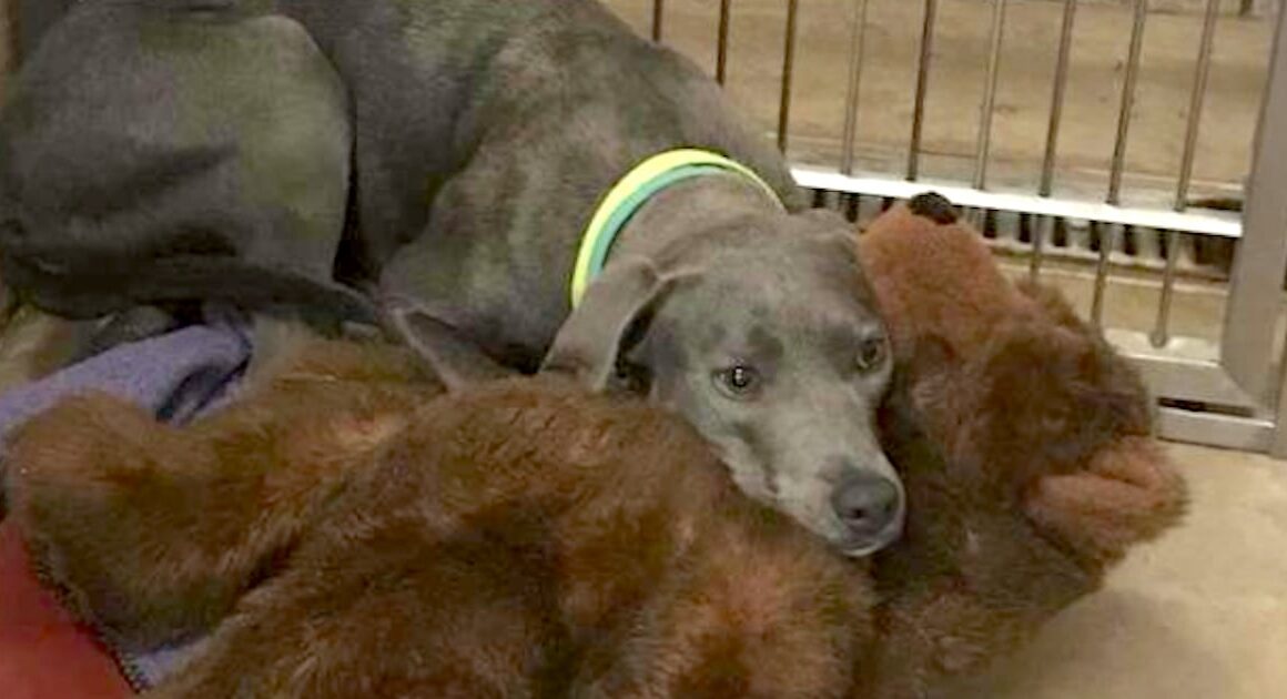 A one-year-old Blue Lacy dog named Ellie lived with her family near Dallas, Texas, until one day when they decided to surrender her to a local shelter. All she could do was cling to the only thing she had left in the world, her giant teddy bear.